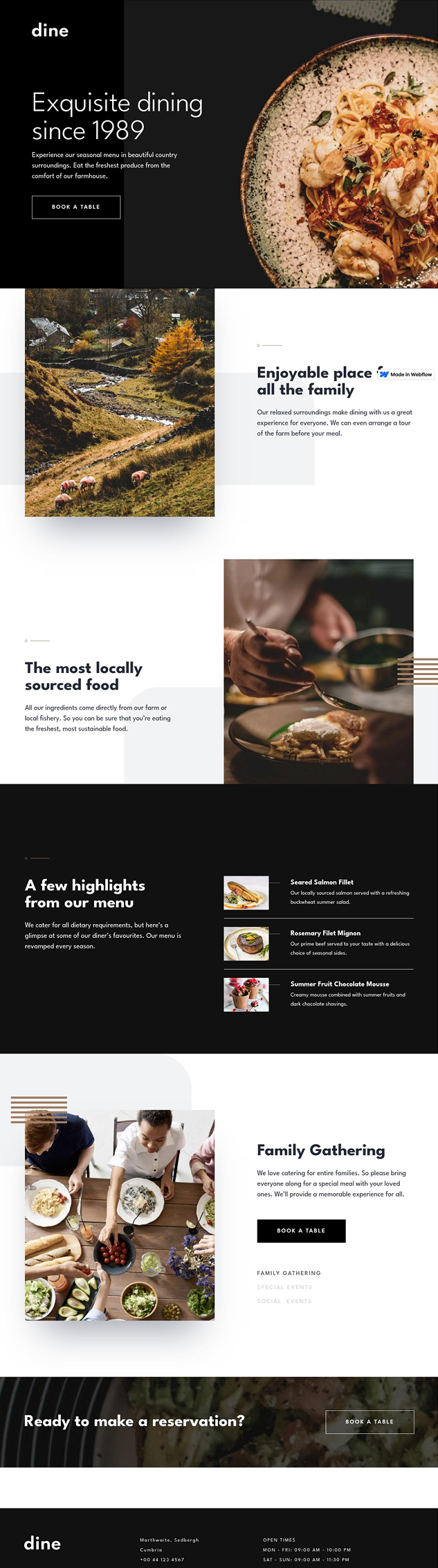 A modern restaurant website built in Webflow with a clean, responsive design. Features interactive menu displays, reservation booking system, and a visually engaging layout that highlights the restaurant's ambiance and cuisine.